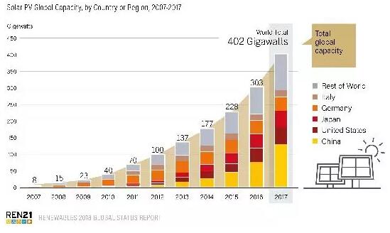 太陽能光伏新增裝機容量達到創紀錄的水平: 與2016年相比,太陽能光伏發電裝機總量增加了29%,達到98GW。光伏新增裝機容量大于燃煤、天然氣和核電凈增裝機容量之和。此外,全球風電新增裝機容量52GW,也對可再生能源總裝機容量起到了擴充作用。