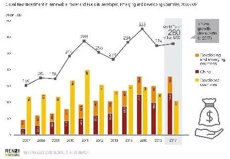但對新增可再生能源發電的投資已超過對新增化石燃料和核能發電投資總和的兩倍以上。 由于成本競爭力的提高,2017年可再生能源投資占電力行業總投資的比例超過三分之二,同時可再生能源在電力行業的份額仍將會繼續上升。