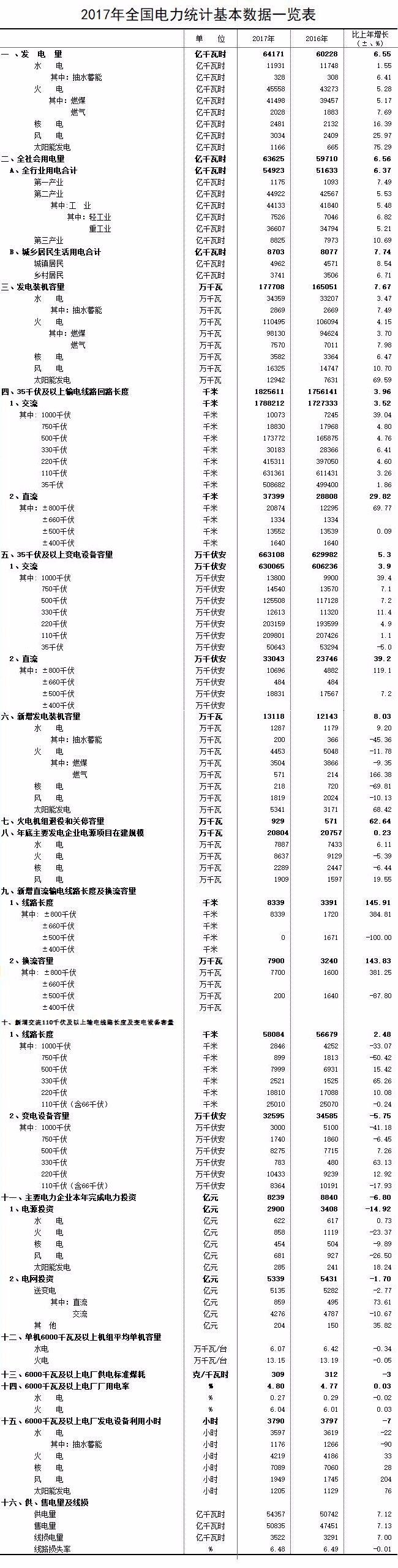 日前中電聯(lián)行業(yè)發(fā)展與環(huán)境資源部發(fā)布了《2017年電力統(tǒng)計(jì)基本數(shù)據(jù)一覽表》,數(shù)據(jù)顯示2017年全社會用電量為63625億千瓦時(shí),比2016年增長6.56%;主要電力企業(yè)本年完成電力投資共計(jì)8239億元,比2016年減少6.8億元。詳情如下: