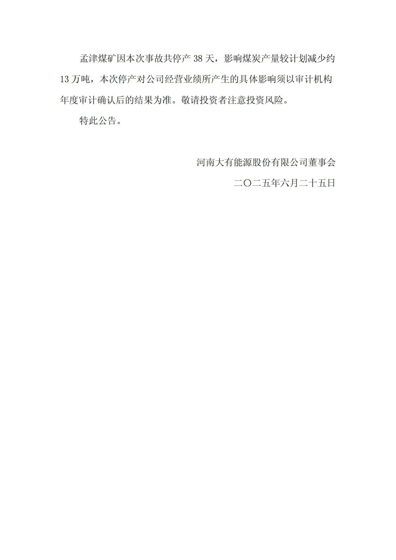 2025年5月15日,大有能源全資子公司義馬煤業集團孟津煤礦有限責任公司(以下簡稱“孟津煤礦”)因發生一起事故而停產。孟津煤礦因本次事故共停產38天,影響煤炭產量較計劃減少約13萬噸。