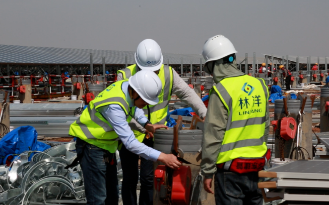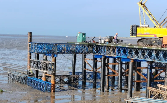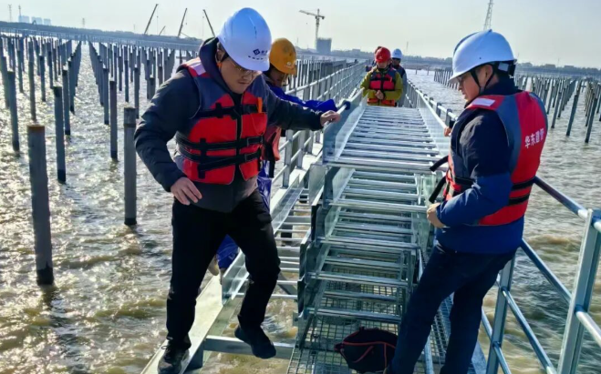 面對(duì)潮間帶施工困難的情況,林洋新能源建設(shè)團(tuán)隊(duì)將先筑臺(tái)、后建站定為首要任務(wù)。根據(jù)施工規(guī)劃,兩座6400平方米的貝雷結(jié)構(gòu)平臺(tái)需在1個(gè)月內(nèi)建成,項(xiàng)目組實(shí)行設(shè)計(jì)、施工、監(jiān)測(cè)三班倒機(jī)制:技術(shù)組白天駐守現(xiàn)場(chǎng)優(yōu)化鋼管樁打入角度,夜晚核算貝雷架承重?cái)?shù)據(jù);施工隊(duì)分成打樁、焊接、防腐三個(gè)班組交叉作業(yè),在每日兩次潮水退去的間隙搶工。在團(tuán)隊(duì)的齊心協(xié)作下,直徑0.63米的鋼管樁群穩(wěn)穩(wěn)扎入灘涂,連接平臺(tái)與海堤的鋼棧橋同步貫通,為后續(xù)近9萬(wàn)根預(yù)制樁、百萬(wàn)塊組件的運(yùn)輸安裝奠定基礎(chǔ)。