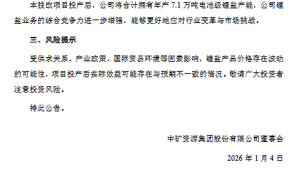根據(jù)公告顯示,中國(guó)中礦資源下屬全資公司中礦資源(江西)鋰業(yè)有限公司(以下簡(jiǎn)稱“中礦鋰業(yè)”)投資建設(shè)年產(chǎn)3萬(wàn)噸高純鋰鹽技改項(xiàng)目已完成建設(shè)并取得試生產(chǎn)備案,于2026年1月2日點(diǎn)火投料試生產(chǎn)運(yùn)營(yíng)。