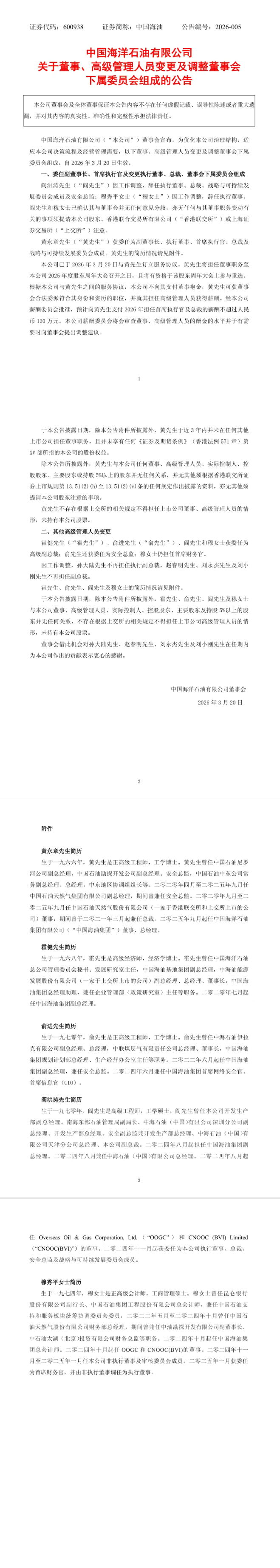 3月20日,中國海油(600938.SH、00883.HK)對外宣布多項(xiàng)管理層人事調(diào)整。其中,黃永章獲委任為中國海油副董事長、執(zhí)行董事、首席執(zhí)行官、總裁及戰(zhàn)略與可持續(xù)發(fā)展委員會成員。