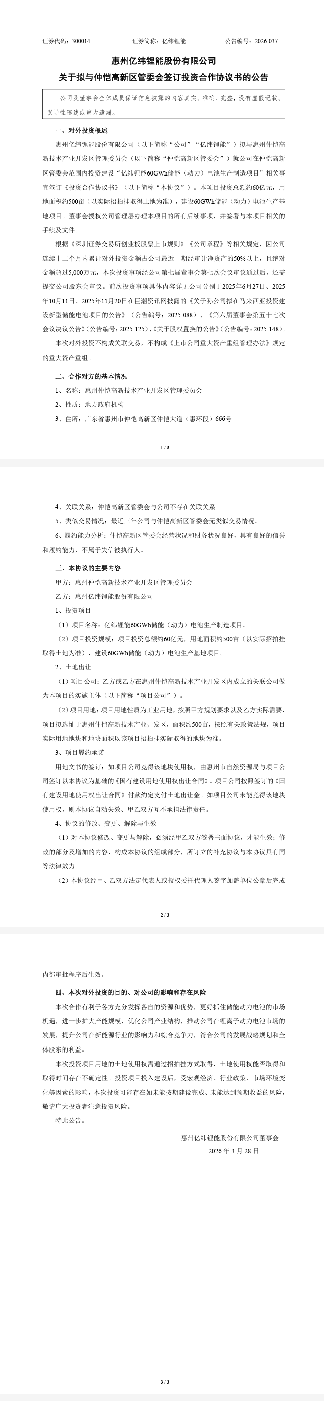 3月27日,億緯鋰能發布公告稱,公司擬與惠州仲愷高新技術產業開發區管理委員會就公司在仲愷高新區管委會范圍內投資建設“億緯鋰能60GWh儲能(動力)電池生產制造項目”相關事宜簽訂《投資合作協議書》。本項目投資總額約60億元,用地面積約500畝(以實際招拍掛取得土地為準),建設60GWh儲能(動力)電池生產基地項目。