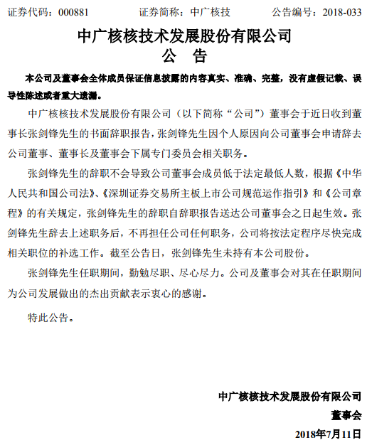 中廣核核技術發展股份有限公司發布公告,張劍鋒因個人原因向公司董事會辭去公司董事、董事長及董事會下屬專門委員會相關職務。截至公告日,張劍鋒未持有本公司股份。