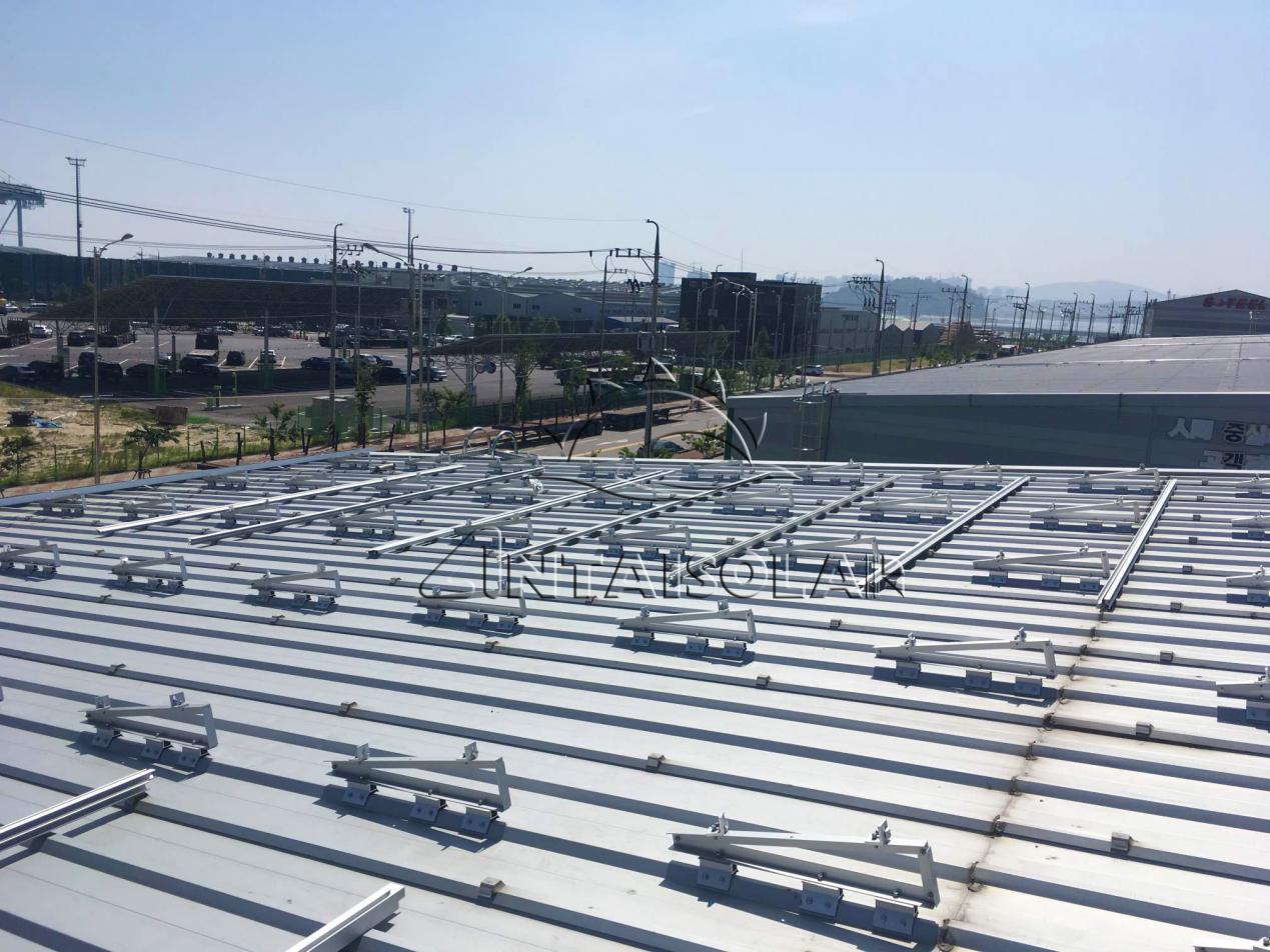 仁川港項目的屋頂類型為梯形彩鋼瓦,包含東西方向傾斜屋頂和南北方向傾斜屋頂,針對不同角度的屋頂,為了實現發電效率最大化,安泰工程師提供四種安裝解決方案,其中包括3種不同角度的三腳架;梯形夾具 + 三腳架 的支架方案在設計上極大地簡化了安裝步驟,從而大幅提升安裝效率,并且很大程度上為客戶減少了運輸和倉儲成本。