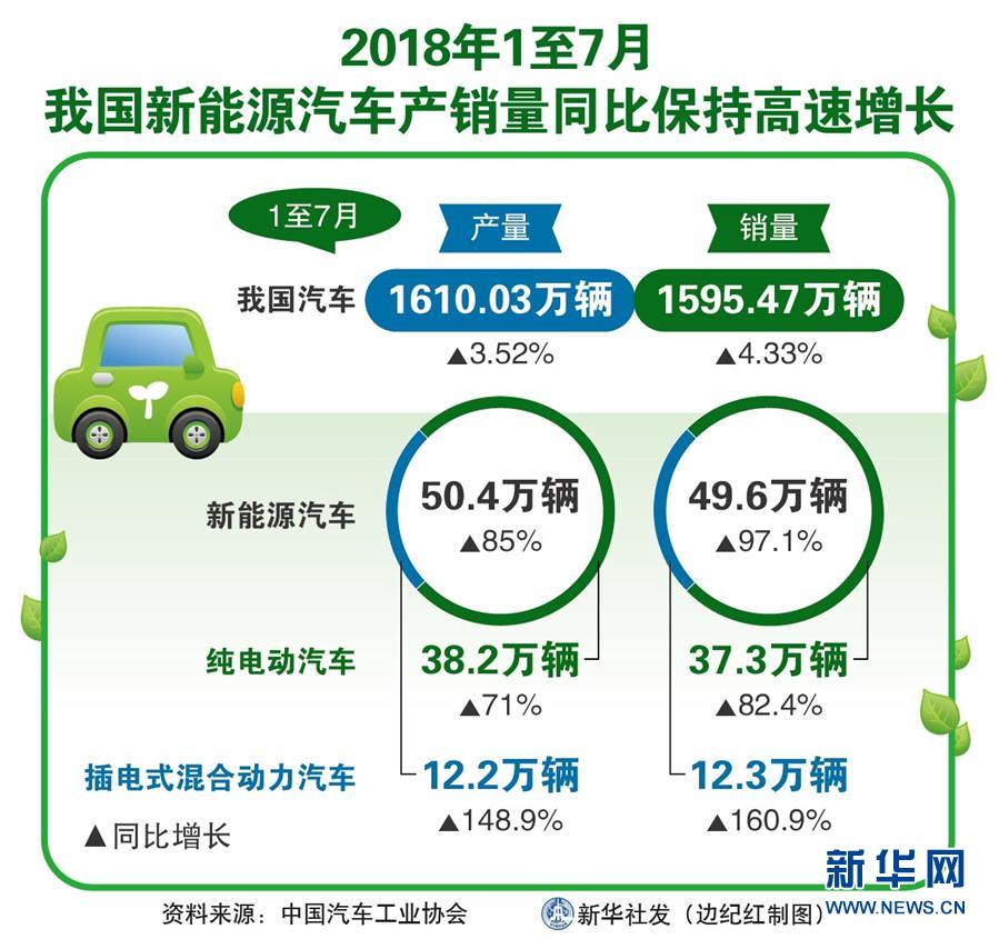 記者10日從中國汽車工業協會獲悉,1至7月我國汽車產銷量繼續保持小幅增長,其中,新能源汽車產銷分別完成50.4萬輛和49.6萬輛,比上年同期分別增長85%和97.1%,新能源汽車產銷量同比呈現高速增長態勢。