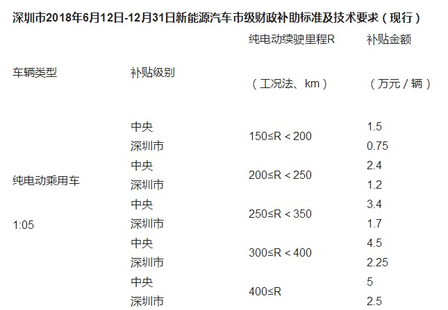 2、2018年2月12日至2018年6月11日上牌的新能源乘用車、純電動客車,按照深圳市2017年補貼標準的0.7倍補貼,純電動貨車和專用車按對應標準的0.4倍補貼,燃料電池汽車補貼標準不變。