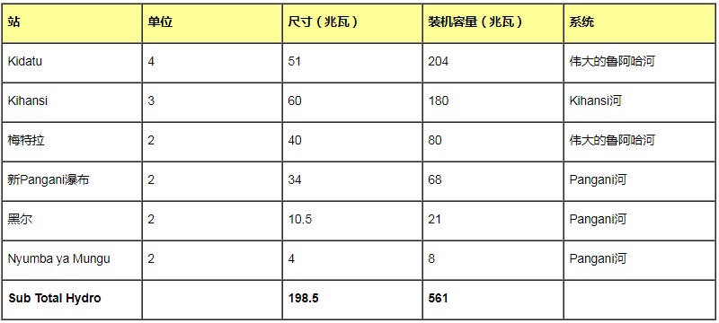 坦桑尼亞估計的總水電潛力為4700兆瓦。到2006年底,安裝的水力發(fā)電量為561兆瓦。表1列出了現(xiàn)有水電站的清單。