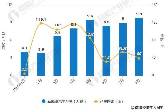據前瞻產業研究院發布的《新能源汽車行業市場前瞻與投資戰略規劃分析報告》統計數據顯示,2018年8月新能源汽車產銷分別完成9.9萬輛和10.1萬輛,比上年同期分別增長39%和49.5%。累計方面,2018年1-8月,新能源汽車產銷分別完成60.7萬輛和60.1萬輛,比上年同期分別增長75.4%和88%。預計2018年我國新能源汽車銷量將達到150萬輛,到2020年新能源汽車產銷量將達到200萬輛左右。
