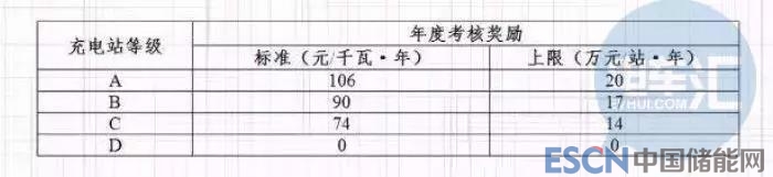 二是年度考核獎勵,即在考核年度內對公用充電站的安全生產、維護管理、互聯互通等管理情況進行考核評價,引導企業加強運維管理,鼓勵社會公用充電設施發揮“持槍站崗”作用,為用戶提供安全穩定的服務。根據考核評價結果,對考核評價最好的A級充電站給予106元/千瓦·年的獎勵,獎勵上限為20萬元/站·年。