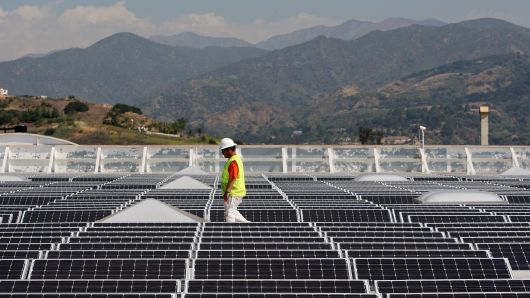 太陽能電池板覆蓋在加利福尼亞州格倫多拉的Sam's Club商店的屋頂。