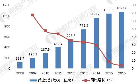 2008-2016年中國(guó)合同能源管理行業(yè)投資規(guī)模變化情況(單位:億元,%)