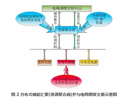 總體而言,已有研究大多針對集中式大容量的儲能系統,而對于分布式儲能參與電網輔助服務的協同控制技術研究還較少。如何構建規模化分布式儲能匯聚效應的動態仿真模型,協調控制多點布局的分布式儲能以及柔性負荷,亟需開展相關內容的深入研究與應用。有研究定義了負荷聚合商概念,因此進一步可以擴展到儲能參與需求響應和提供輔助服務中,將會出現“資源聚合商”,未來資源聚合商將匯聚若干分布式用戶儲能參與電力市場交易,基本框架如圖 2 所示。