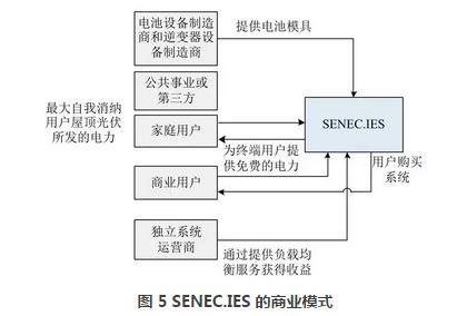 目前,與分布式光伏組合形成的分布式光儲系統在國外已有較多的商業應用,在不同的國家,分布式光儲發電的應用重點各不相同,美國加州在工商業領域的分布式項目居多,澳大利亞和德國市場的重點在戶用儲能領域。以德國 SENEC.IES 公司為例,該公司將用戶側儲能聚集起來開展“免費午餐”模式,享有對電池的主要控制權,當電網“零電價”時控制電池從電網充電。用戶主要通過最大化地自我消納屋頂光伏所發的電力、使用 SENEC.IES 提供給用戶的“免費儲存的電力”,實現更低的電費賬單,進而獲益。SENEC.IES 的商業模式見圖5。