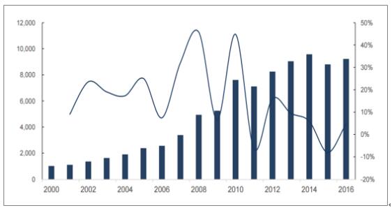 2000年-2016年國內生產總值(億元)及增速(%)