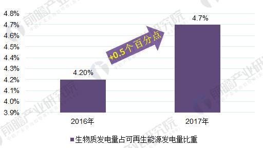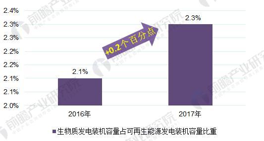 圖表4:2016-2017年生物質(zhì)能源發(fā)電裝機容量占可再生能源發(fā)電裝機容量比重變化情況(單位:%)