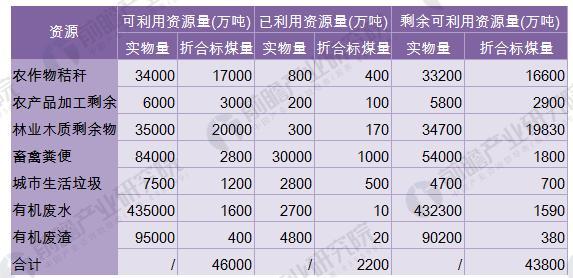 全國農(nóng)作物秸稈年產(chǎn)生量約為8億噸,除部分作為造紙原料和畜牧飼料外,大約3.4億噸可作為燃料使用,折合約1.7億噸標準煤;林木枝椏和林業(yè)廢棄物年可獲得量約9億噸,大約3.5億噸可作為能源利用,折合約2億噸標準煤;甜高粱、小桐子、黃連木、油桐等能源植物(作物)可種植面積達2000多萬公頃,可滿足年產(chǎn)量約5000萬噸生物液體燃料的原料需求;畜禽養(yǎng)殖和工業(yè)有機廢水理論上可年產(chǎn)沼氣約800億立方米,全國城市生活垃圾年產(chǎn)生量約1.2億噸。