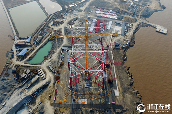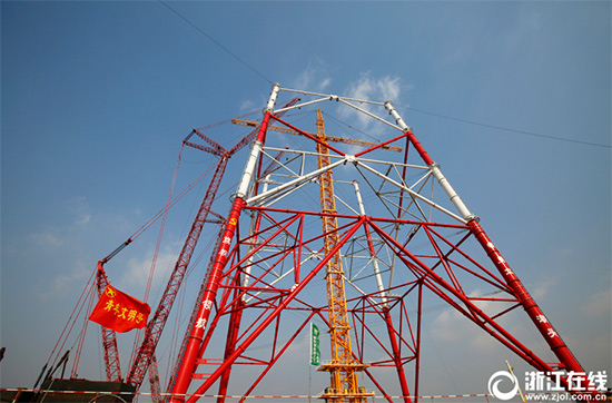 2月6日,舟山500千伏聯網輸變電工程西堠門大跨越金塘側建設工地上,380米高塔項目建設正在穩步推進,目前已達112米。據了解,舟山500千伏聯網輸變電工程將在舟山的金塘島和冊子島各建一座標高380米的輸電高塔(比埃菲爾鐵塔還高56米),計劃于2018年10月完成立塔。
