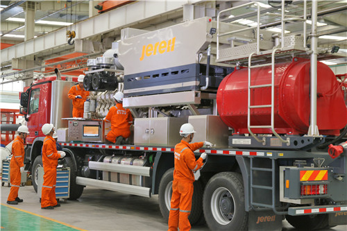 壓裂車是專門開采頁巖氣的高端油氣設(shè)備,杰瑞自主研發(fā)的“阿波羅一號(hào)”渦輪壓裂車,搭載了用于直升機(jī)的5600馬力的渦輪發(fā)動(dòng)機(jī),可以在游艇上使用的高速減速箱,全球油田領(lǐng)域水馬力最大的柱塞泵,將清潔能源頁巖氣開采效率整整提高一倍。