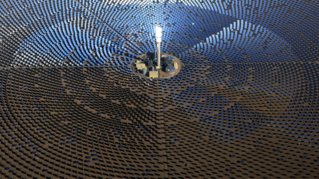 該場域?qū)仢M12,000面鏡子,利用鏡子聚集太陽光至中央220米的高塔,其內(nèi)部熔鹽(moltensalt)將加熱到攝氏565度,并利用熱交換器(heatexchanger)將熱能轉(zhuǎn)移至水中產(chǎn)生蒸氣,可用于蓄熱或是用蒸氣來驅(qū)動發(fā)電機。