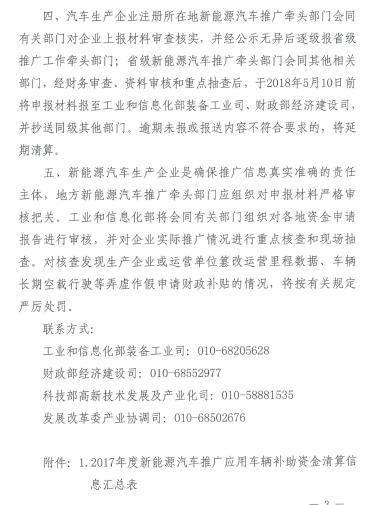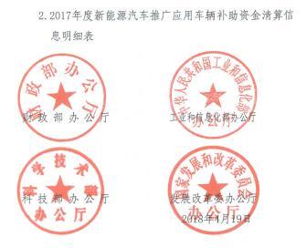 4月19日,財政部、工信部、科技部、發改委發布了《關于開展2017年及以前年度新能源汽車推廣應用補貼資金清算申報的通知》,該通知明確提出,各級牽頭部門提交本地汽車生產企業2017年1月1日至12月31日中央財政補貼資金清算申請報告;對于2015年度、2016年銷售上牌但未獲補貼的車輛按照對應年度補貼標準執行;運營類車輛累計行駛里程達到2萬公里(截止2017年12月31日)即可獲得補貼資格。