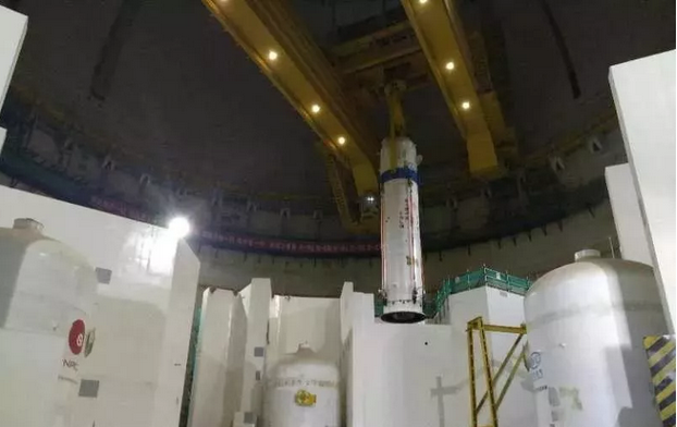 福清5號穩(wěn)壓器空重約104噸,總高13.8米,要將其引入核島需跨越壓力容器及大半個核島,還要避開前期已就位的蒸汽發(fā)生器和主泵等核島主設備,安裝工作難點多且就位要求高。為此核動力院設計人員提前進駐現(xiàn)場,與安裝單位現(xiàn)場分析解決問題,同步修改完善安裝方案,16日歷經(jīng)吊裝、引入、翻轉(zhuǎn)等工序后吊入穩(wěn)壓器隔間,最終于12時26分成功安裝就位。